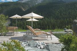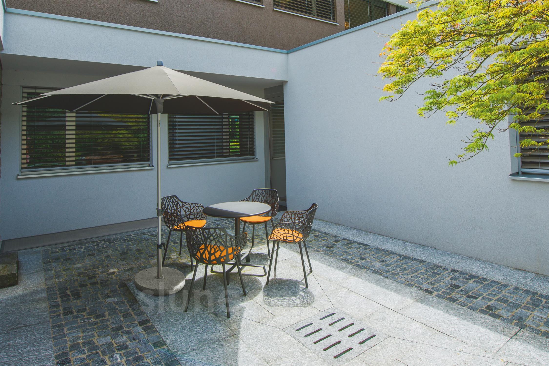 uzávěru na středové tyči. Mezi další výhody slunečníku patří: odolný rám vyrobený z eloxovaného hliníku, slunečník
