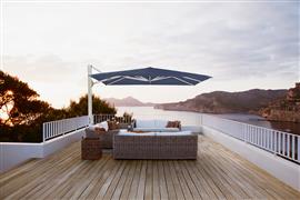 Luxusní boční slunečník Ambiente Nova značky Glatz určený pro náročné privátní zákazníky nebo pro profesionální použití v restauracích, hotelech, welness apod. V rámci příslušenství je možné slunečník elektromotorem, LED světly a otočnou základnou.