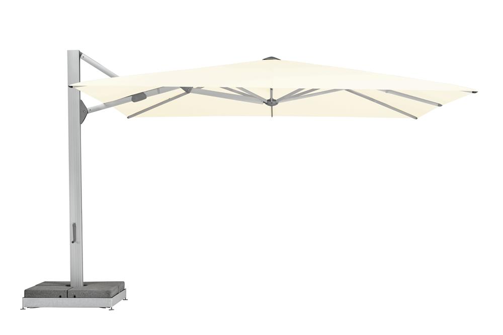 Slunečník je dispozici v následujících rozměrech - kulatý 400 a 500 cm, čtvercový 350x350 a 400x400 cm a obdélníkový 400x300 cm, a 450x350 cm. Slunečník se dodává výhradně s akrylovými světlostálými potahy. Doporučujeme kotvení do země.