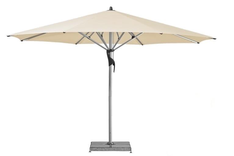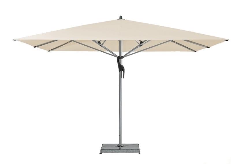 Slunečníky jsou dostupné v několika tvarech a rozměrech: kulatý 450 cm, čtvercový 300x300, 350x350 a 400x400 cm a obdélníkový 350x250 cm a 400x300 cm.