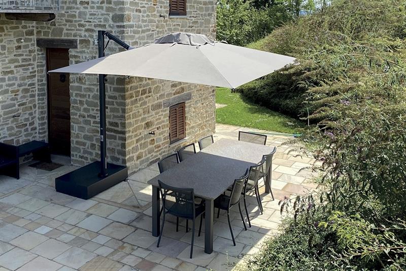 Slunečník s inovativním systémem otevírání a zavírání asistovaným plynovou pružinou. Spojuje moderní technologie s klasickým stylem a je vhodný do všech prostředí. Hliníkový rám s metalickým antracitovým efektem.