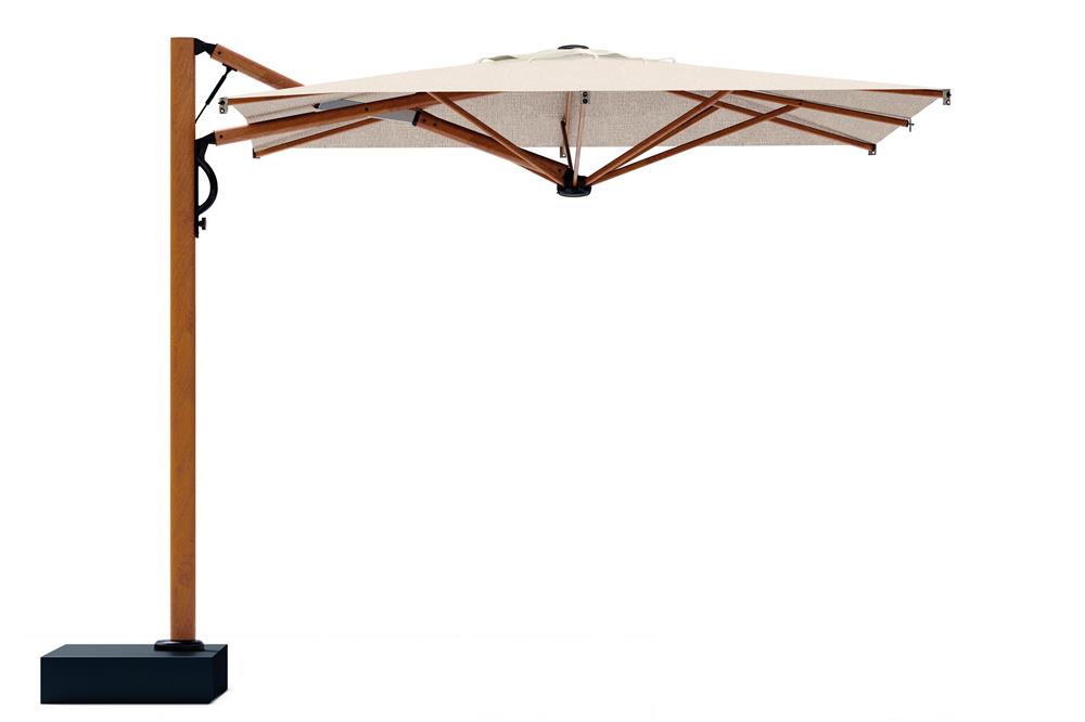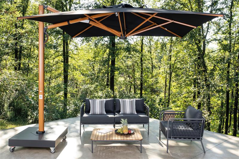 Slunečník s inovativním systémem otevírání a zavírání asistovaným plynovou pružinou. Díky zasouvací konstrukci je možné jej otevírat a zavírat nad stoly a židlemi, aniž by bylo nutné nábytek přesouvat. Rám z hliníku s vysoce odolnou povrchovou úpravou v dekoru dřeva je odolný vůči slané vodě i UV záření. Inovativní řešení, které si získalo velké uznání v oblasti venkovního vybavení.