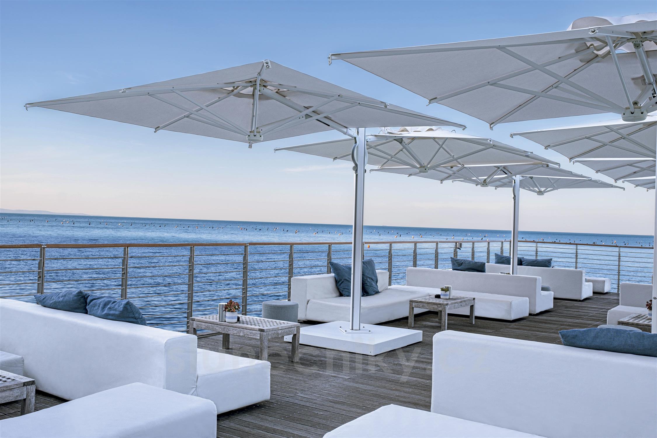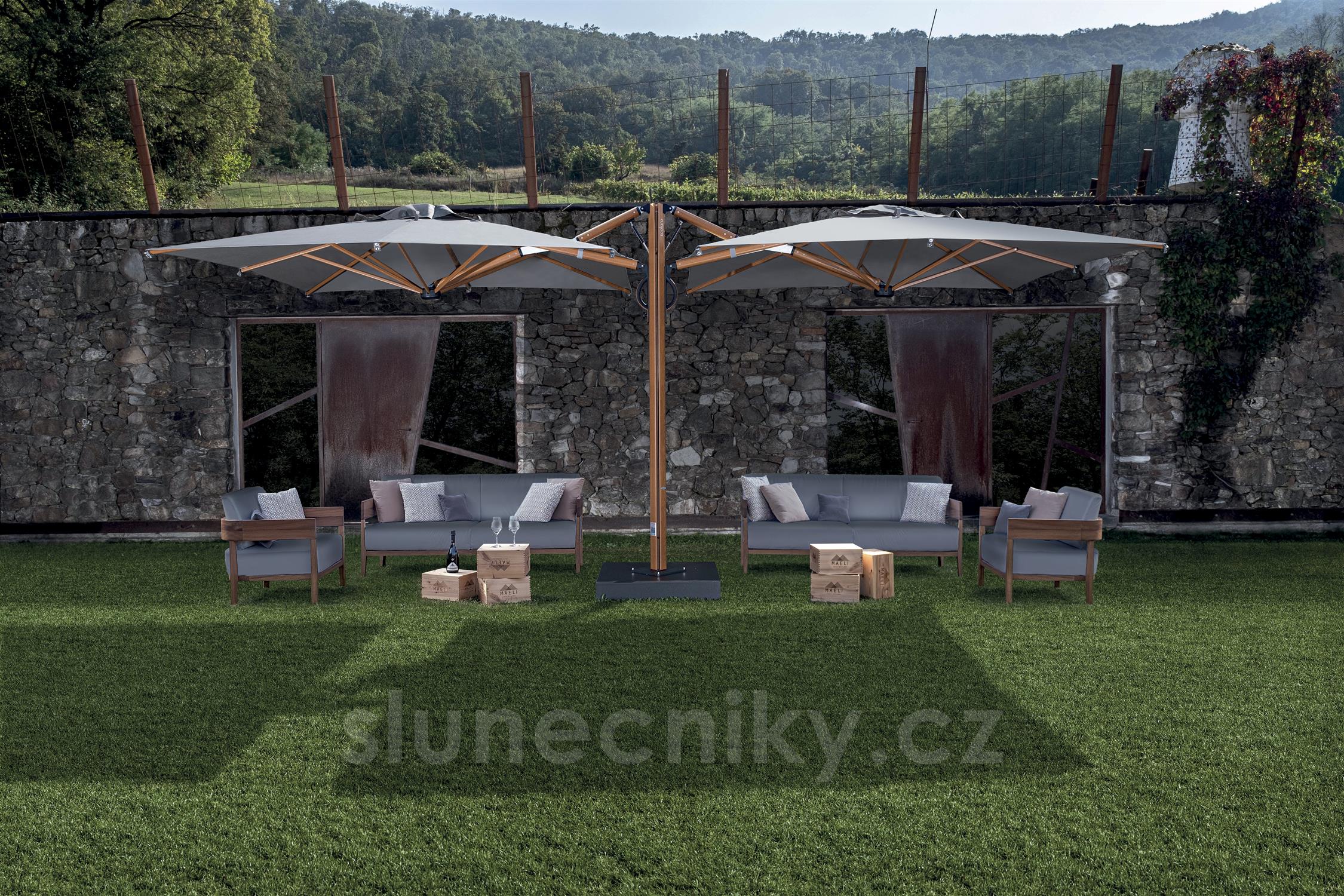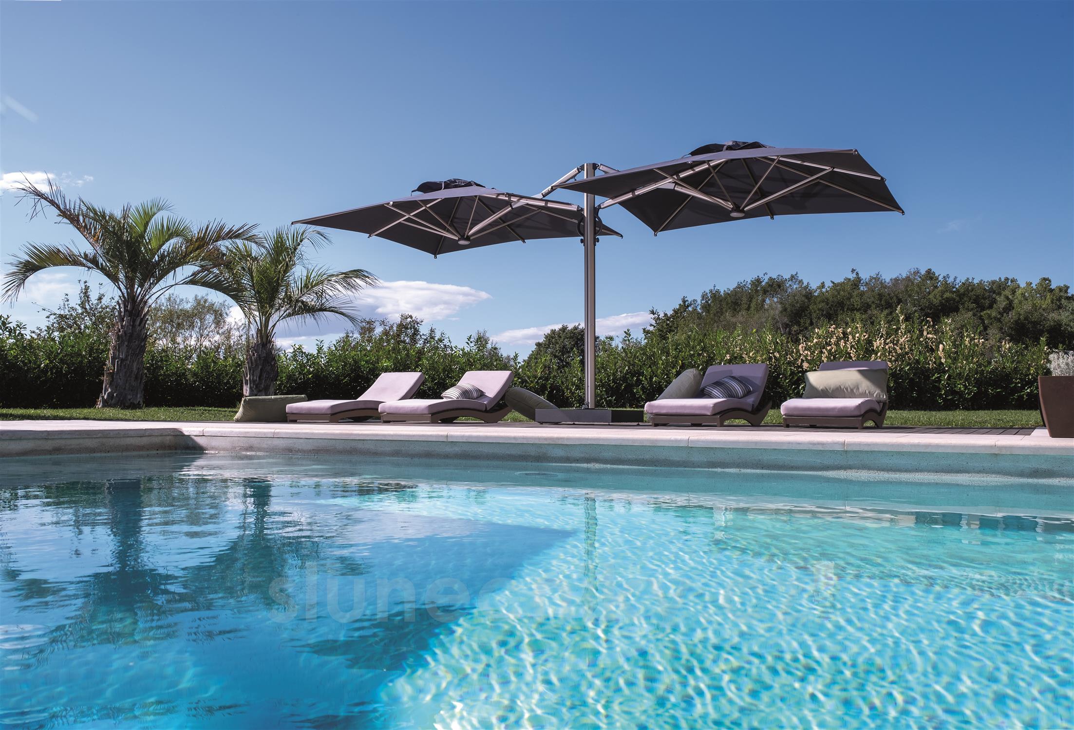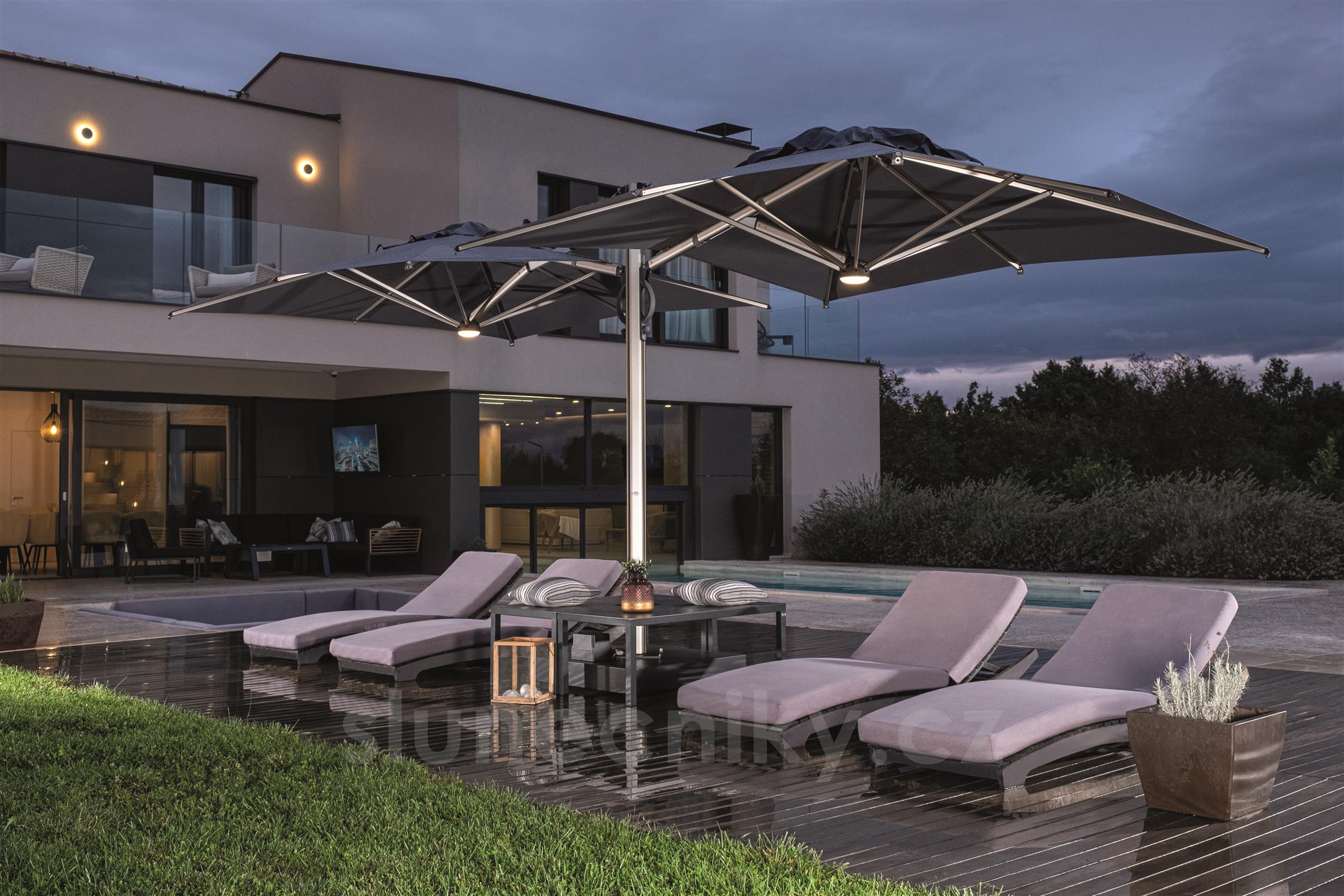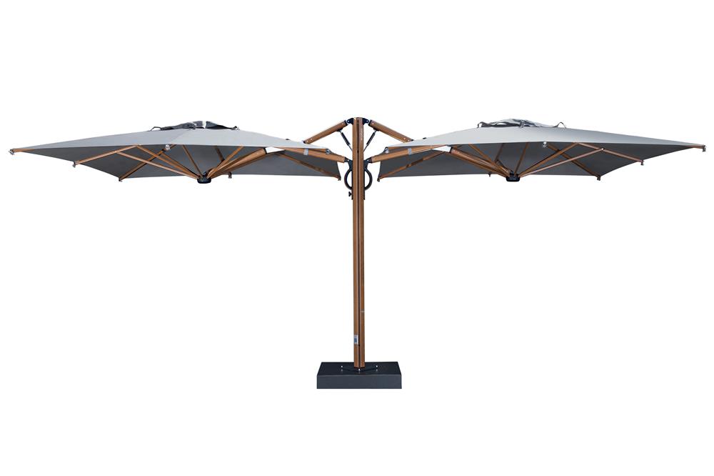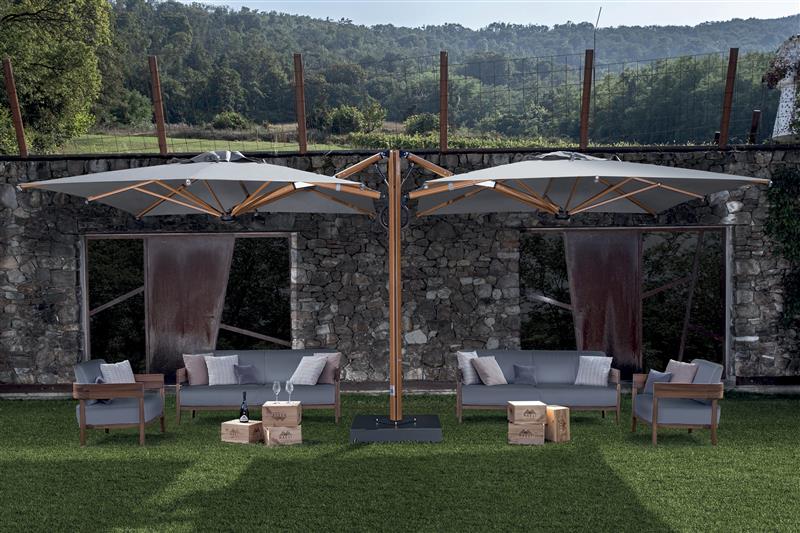 Evoluce samostatného slunečníku Astro s inovativním systémem otevírání a zavírání asistovaným plynovou pružinou. Zasouvací konstrukce umožňuje otevírání a zavírání nad stoly a židlemi bez nutnosti přesouvat nábytek. Vhodný do všech prostředí a doporučený zejména pro komerční využití (bary, restaurace, hotely a terasy). Hliníkový rám. Pevná konstrukce tvořená dvěma slunečníky ukotvenými na jednom společném nosiči a umístěnými symetricky.