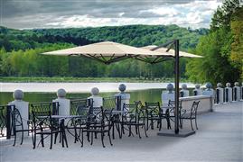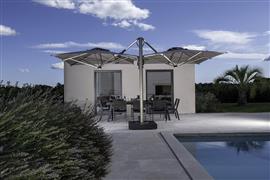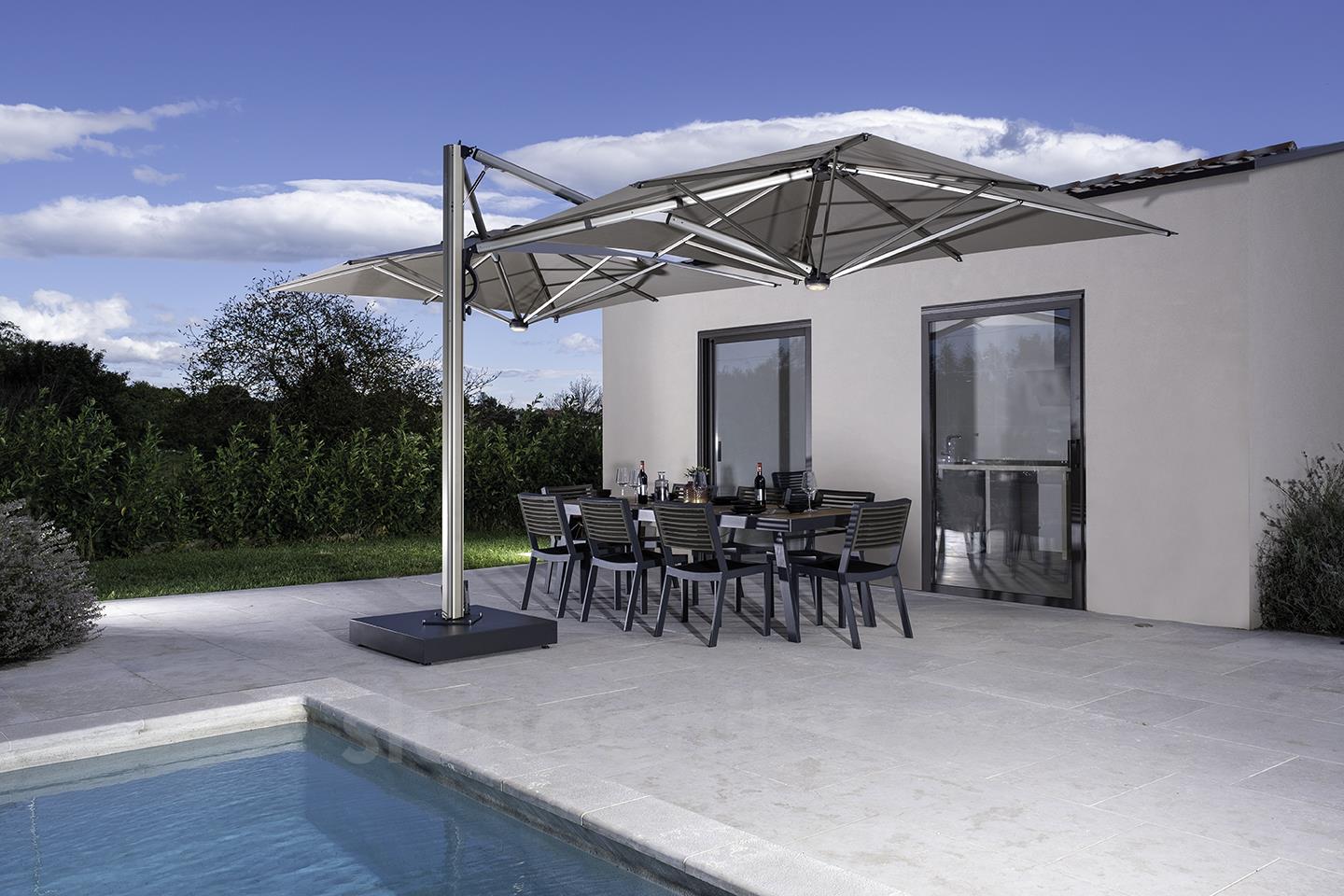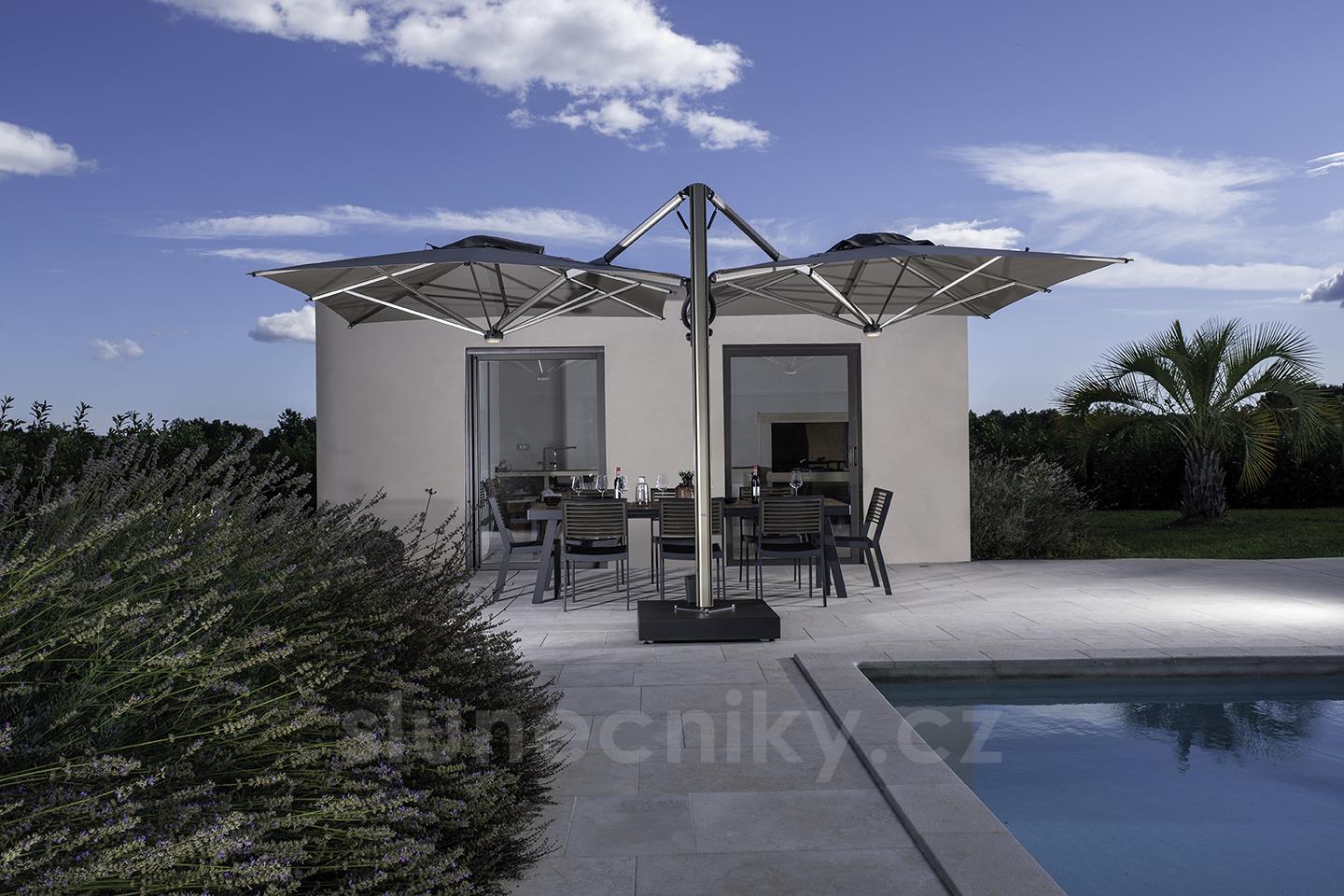 Evoluce samostatného slunečníku Astro s inovativním systémem otevírání a zavírání asistovaným plynovou pružinou. Zasouvací konstrukce umožňuje otevírání a zavírání nad stoly a židlemi bez nutnosti přesouvat nábytek. Vhodný do všech prostředí a doporučený zejména pro komerční využití (bary, restaurace, hotely či terasy). Hliníkový rám. Robustní konstrukce složená ze dvou slunečníků vedle sebe, ukotvených na jednom společném nosiči.