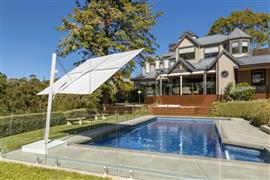 Designový slunečník Versa čtvercový 300x300 cm (3x3 m) značky Umbrosa. Stojný sloup je kolmý k zemi.