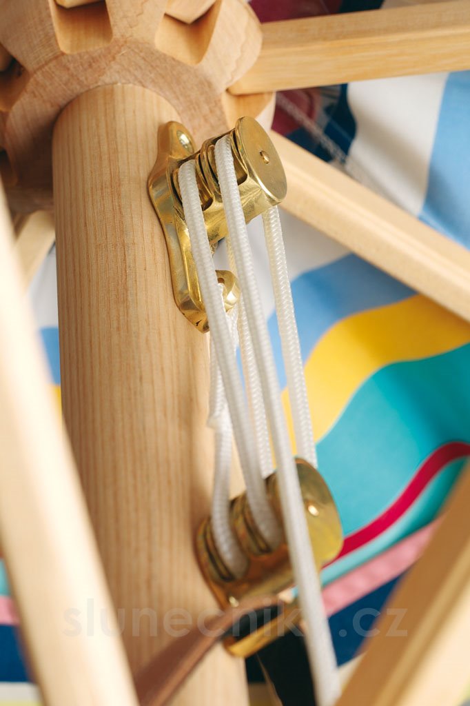 • lankový mechanismus: pro snadné otevření, doporučuje se pro slunečníky s průměrem >300 cm, kladky vyrobeny z nerezavějící leštěné mosazi, tradiční námořní technikou (4-stupňový převod), upevnění ručně šitým páskem z kvalitní kůže, mosazný háček