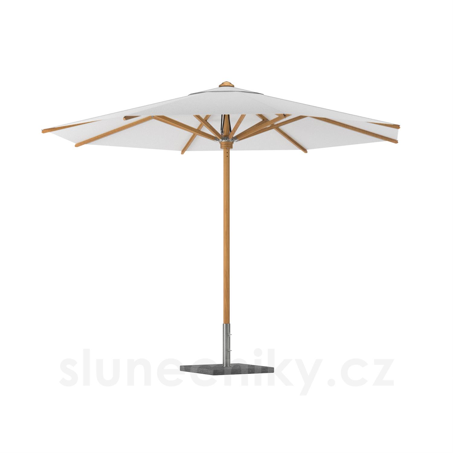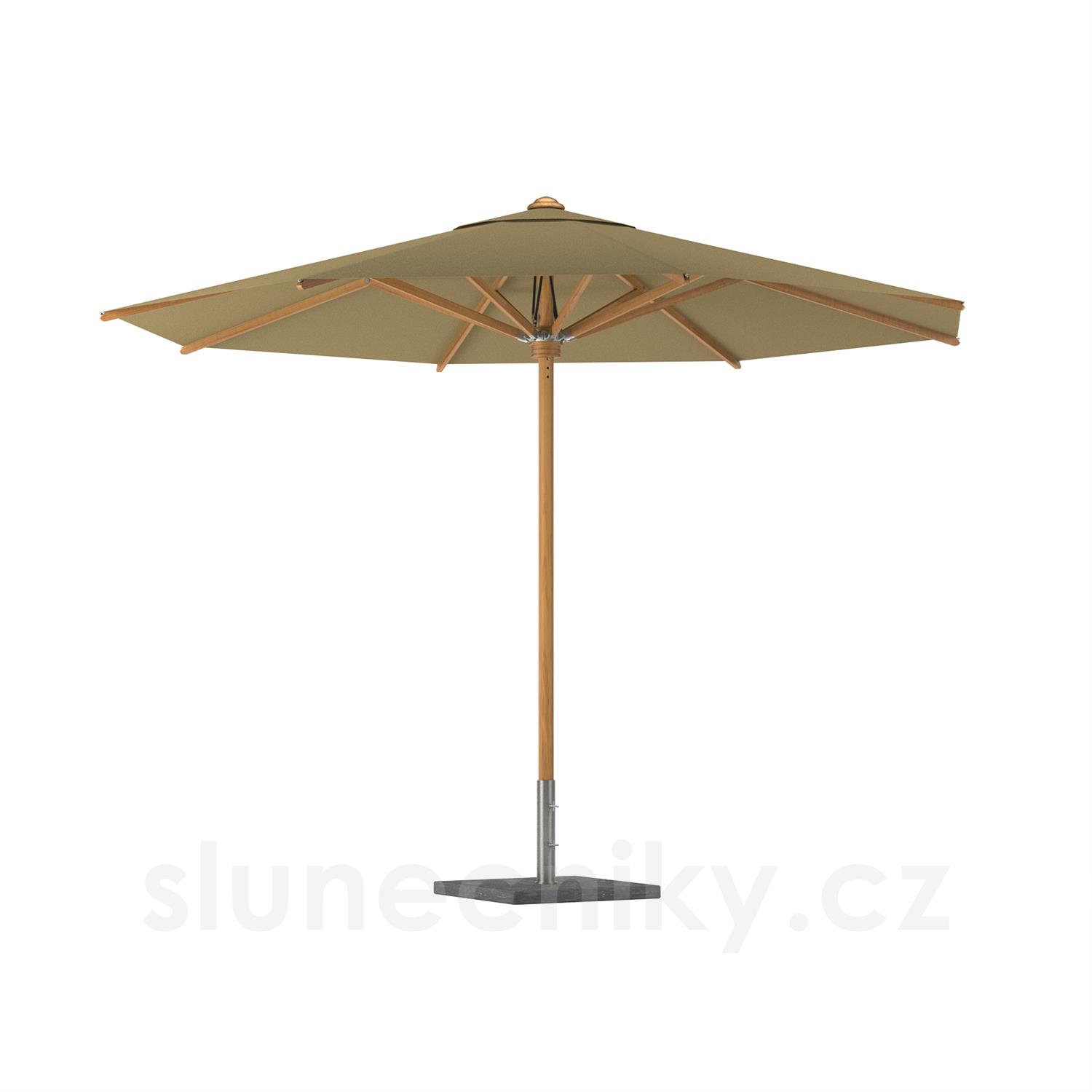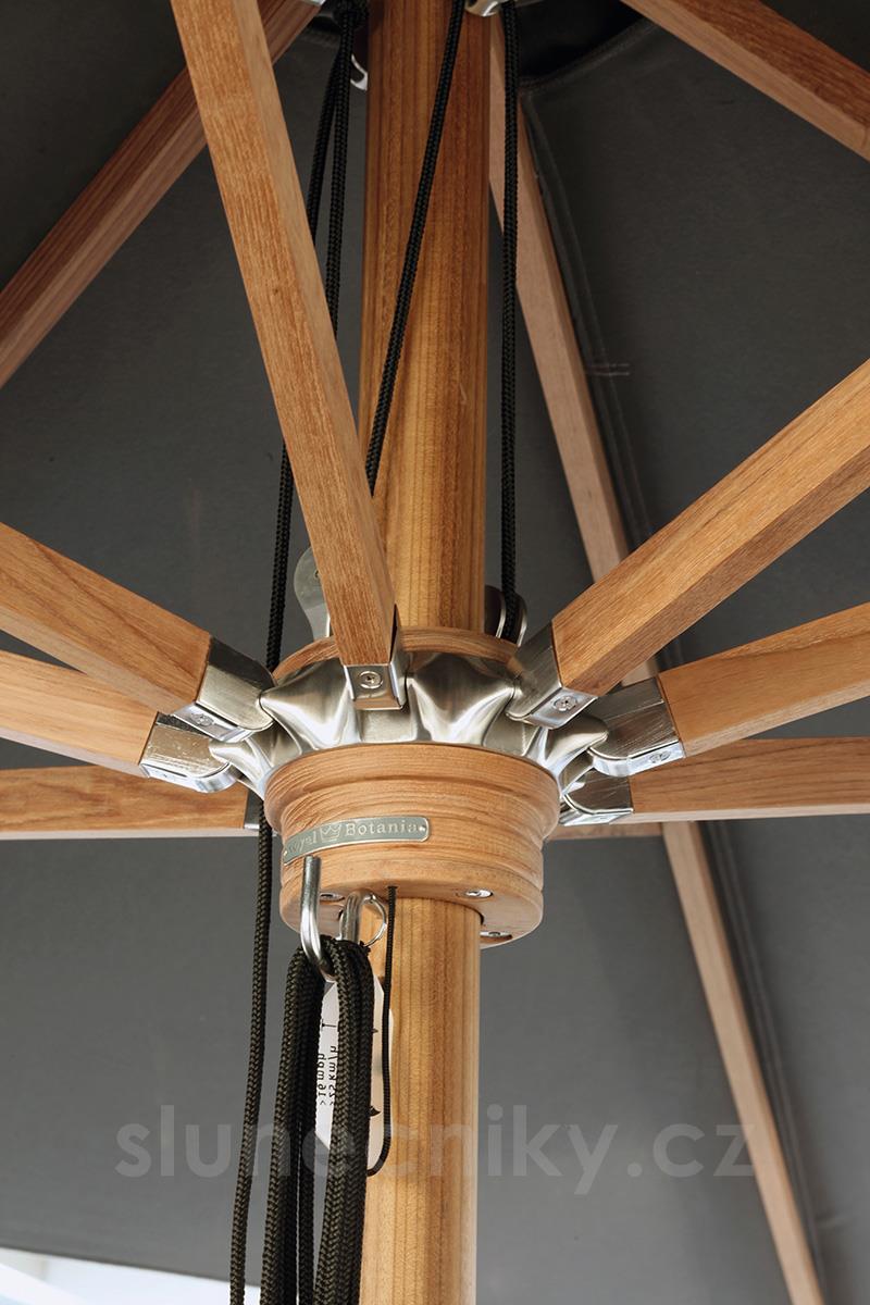 Teakový slunečník Shady belgické značky Roayl Botania má teakový rám a potah ze 100% akrylu.