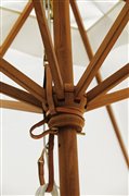 • lankový mechanismus: pro snadné otevření, doporučuje se pro slunečníky s průměrem >300 cm, kladky vyrobeny z nerezavějící leštěné mosazi, tradiční námořní technikou (4-stupňový převod), upevnění ručně šitým páskem z kvalitní kůže, mosazný háček